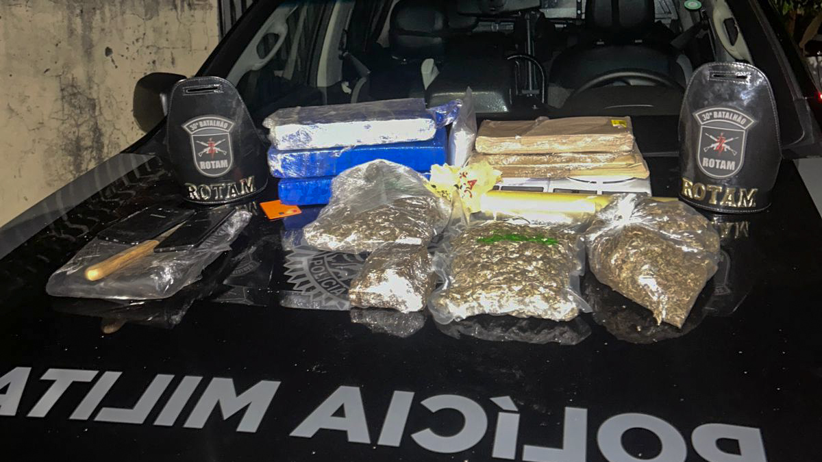 Na residência, os policiais apreenderam aproximadamente 3,8 quilos de maconha, 1,050 quilo de skunk (também conhecida como supermaconha), duas pistolas, facas, balanças de precisão, sacos tipo zip lock e outras embalagens utilizadas para acondicionar drogas. Todo o material foi encaminhado à Central de Flagrantes.