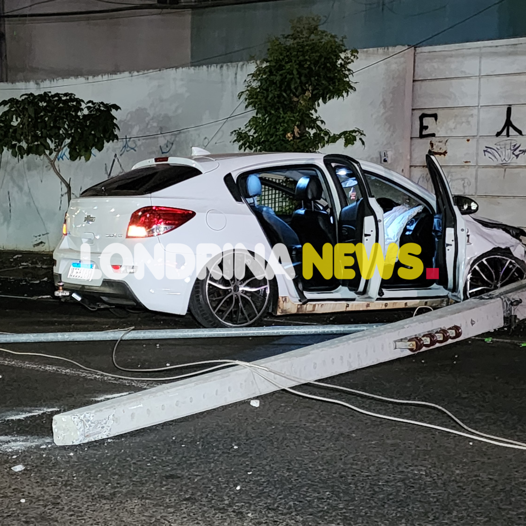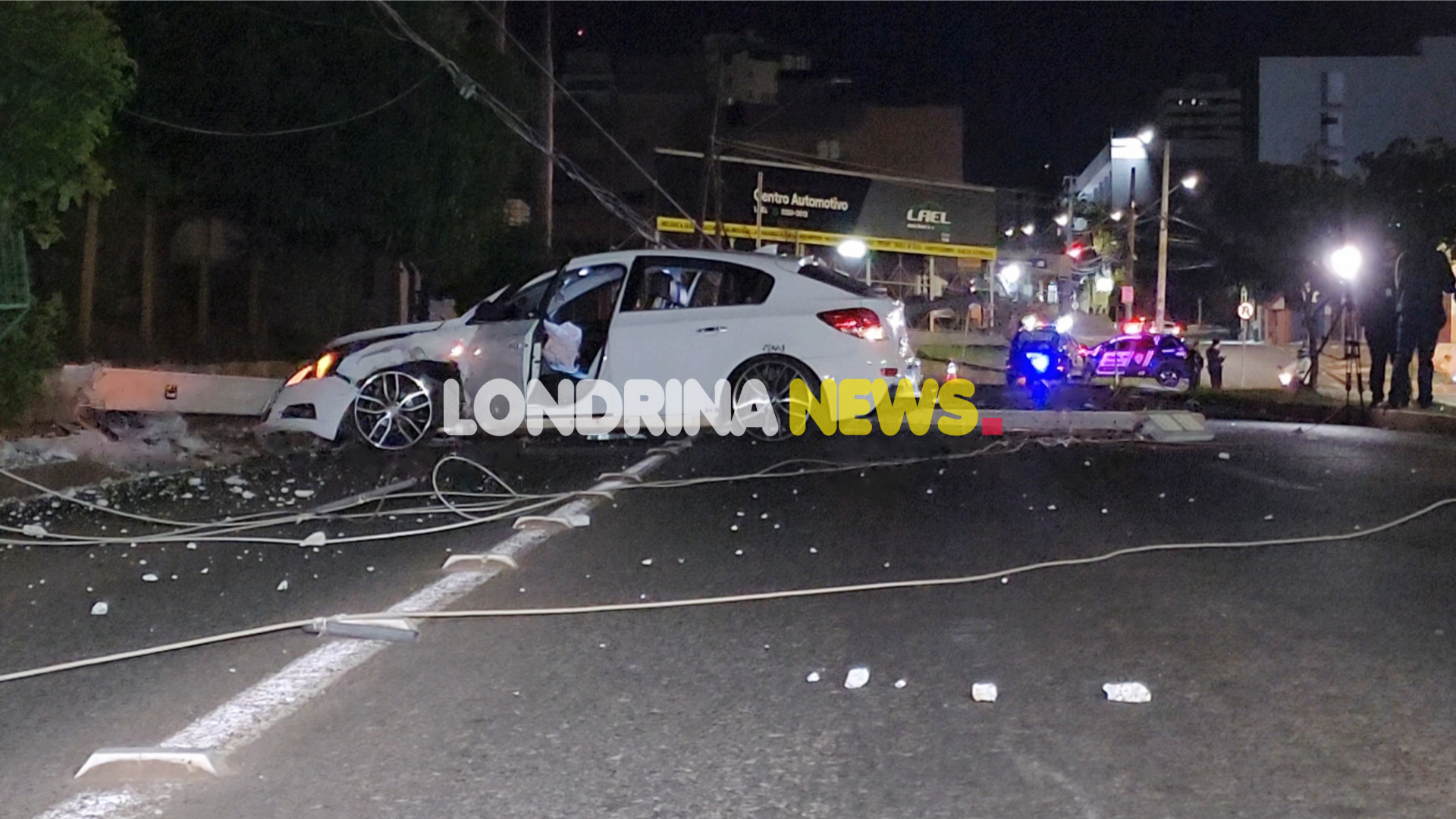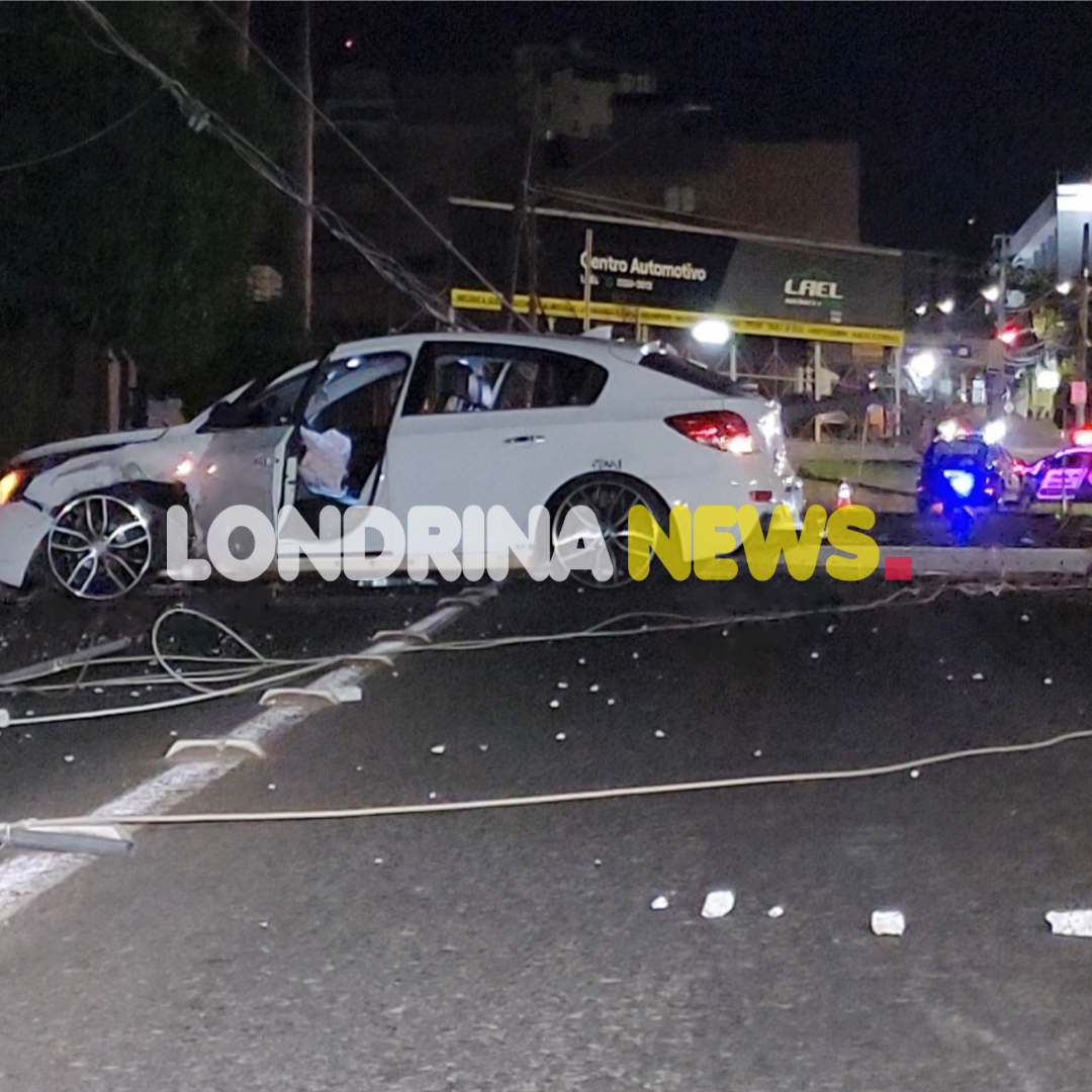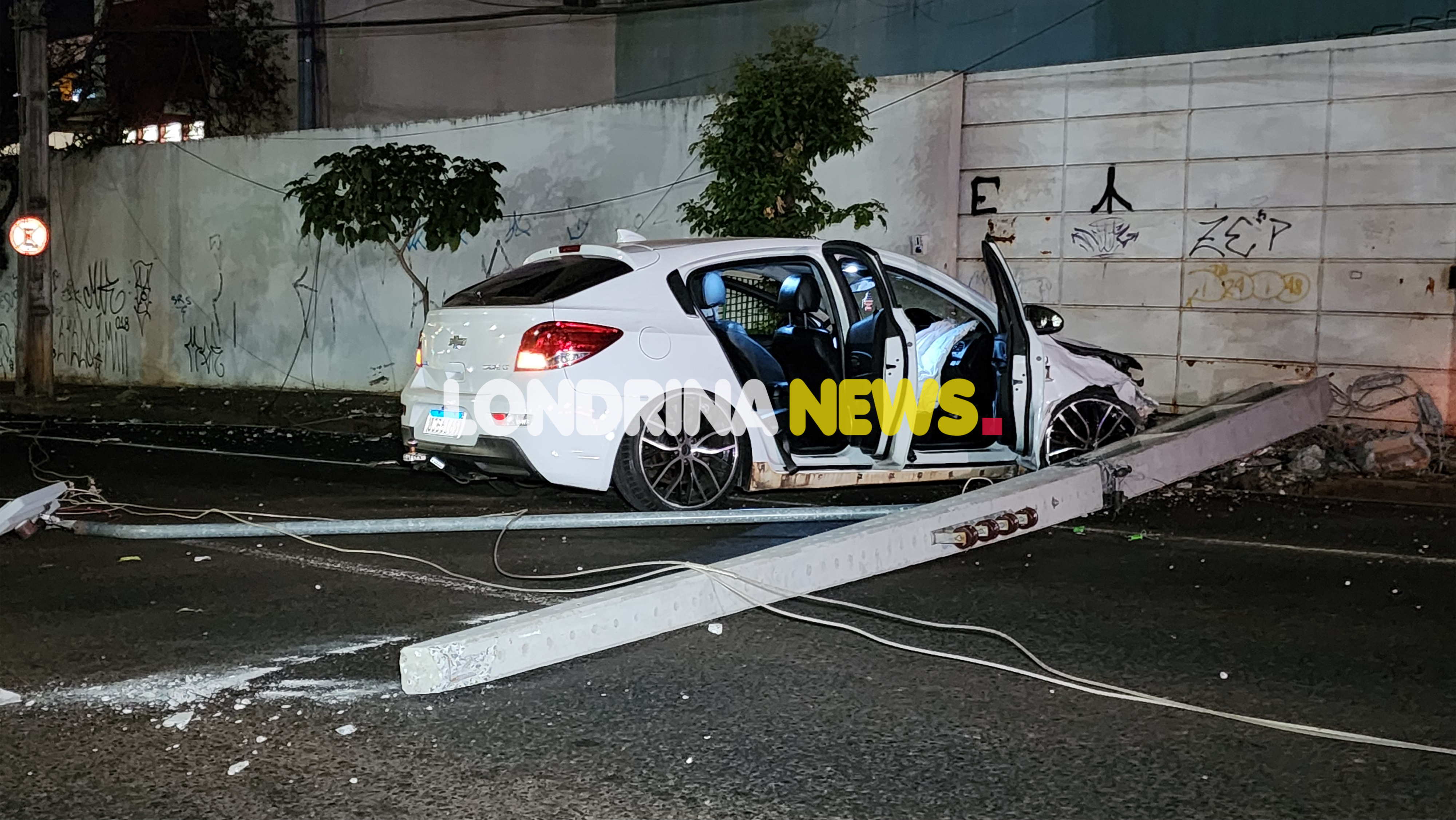 Um acidente na noite deste domingo (20) causou transtornos no trânsito e risco à segurança no centro de Londrina. Um Chevrolet Cruze desgovernado derrubou dois postes de iluminação pública na avenida Arcebispo Dom Geraldo Fernandes (Leste-Oeste), entre as ruas Pernambuco e Professor João Cândido, provocando a interdição parcial da via.