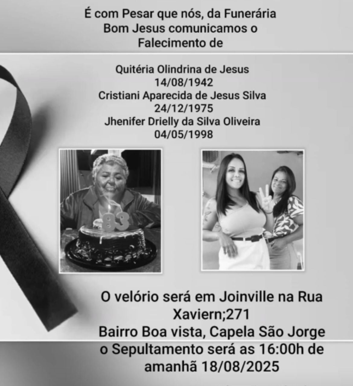 Um grave acidente registrado na manhã deste domingo (17) deixou três pessoas mortas na PR-445, em Cambé, na região de Londrina, norte do Paraná. As vítimas eram da mesma família e foram identificadas como Quitéria Olindrina de Jesus, 83 anos; Cristiane Aparecida de Jesus Silva, 49 anos; e Jhenifer Drielly da Silva de Oliveira, 27 anos, todas residentes em Joinville, Santa Catarina. Quitéria havia completado 83 anos na última quinta-feira (14).