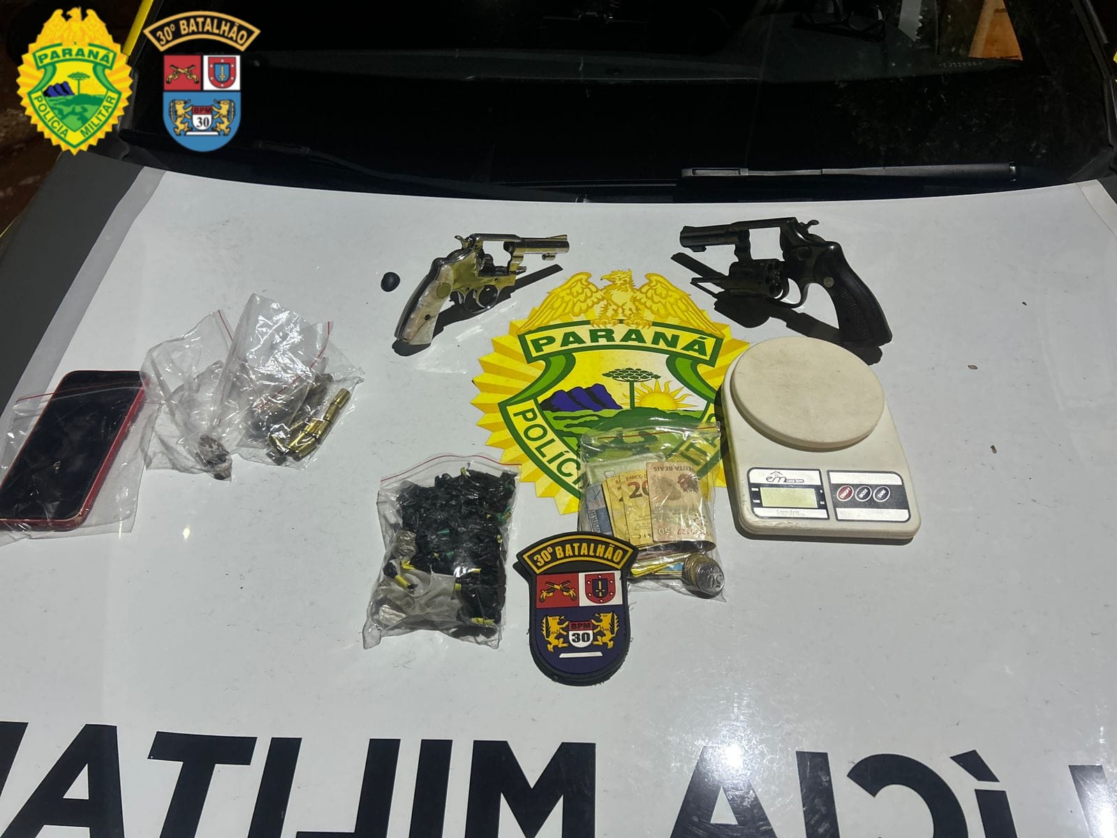 Com eles, a polícia apreendeu um revólver calibre .38 da marca Taurus, um revólver calibre .32 da marca I.N.A., munições, seis estojos de cartucho 9mm, além de 33 porções de cocaína (aproximadamente 10g), 15 porções de maconha (18g), duas porções de crack, R$ 170 em espécie, uma balança de precisão e diversas embalagens plásticas utilizadas para acondicionamento de drogas.