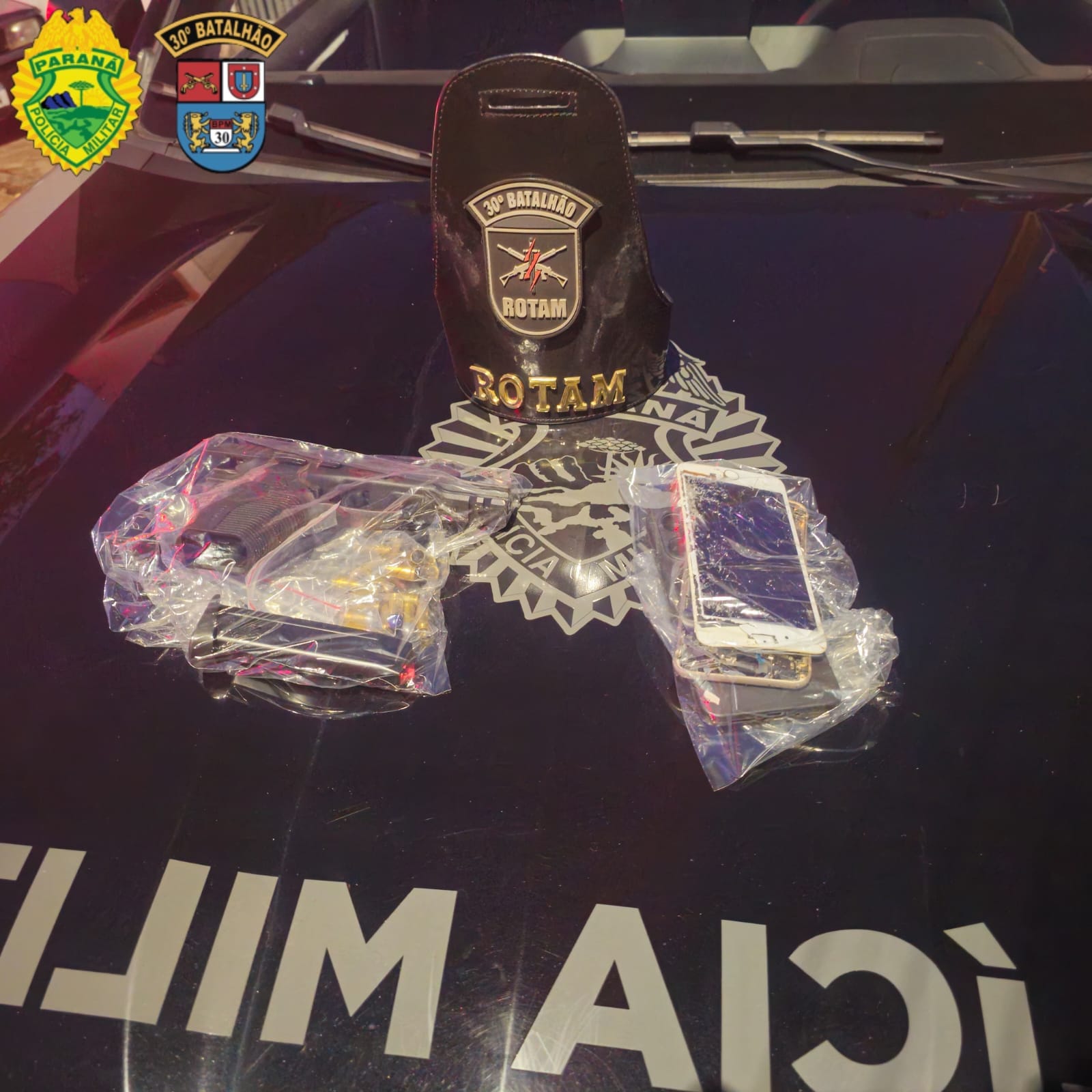 Com o suspeito, foram apreendidos uma pistola Taurus modelo 838, calibre .380 ACP, carregada, além de dois aparelhos celulares, sendo que um deles já estava danificado.