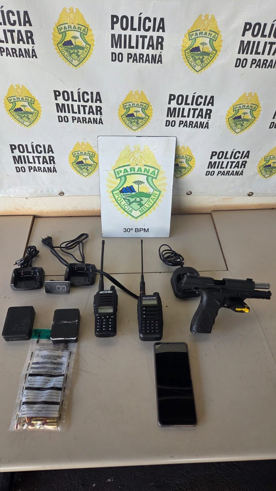 Durante a vistoria no veículo, os policiais localizaram uma pistola calibre 9mm, 17 munições, dois rastreadores veiculares, uma sonda endoscópica, dois rádios comunicadores (HT) e três carregadores de HT.