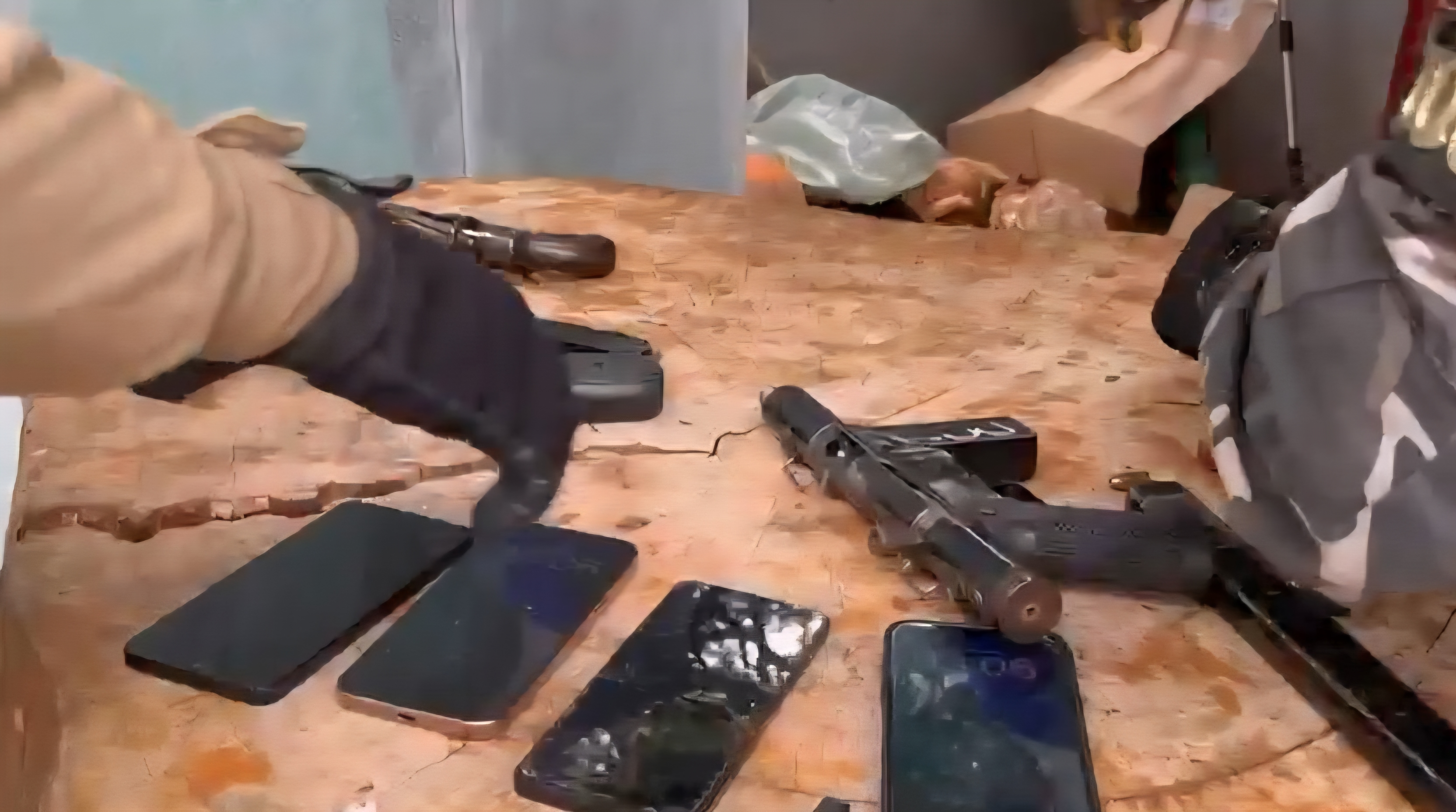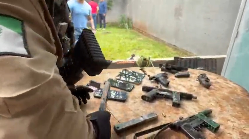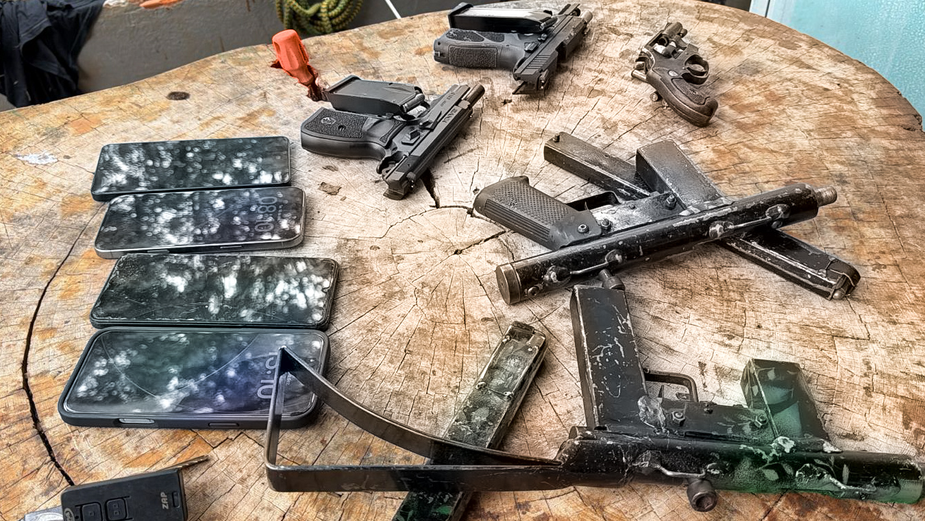 Os indivíduos estavam fortemente armados. No local, foram apreendidas cinco armas de fogo, sendo duas submetralhadoras de fabricação caseira, duas pistolas e um revólver. Cerca de 1 mil aparelhos celulares, possivelmente oriundos de roubos, também foram recolhidos pelas equipes.
