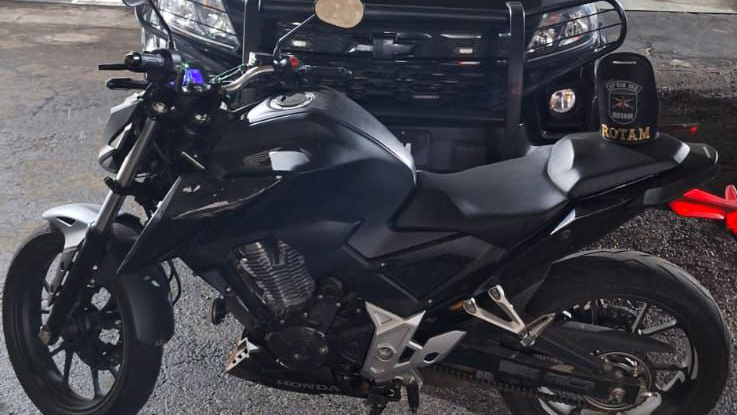 Na verificação da motocicleta abandonada, foi constatado que a placa estava adulterada. Após consulta pelo número do chassi, os policiais confirmaram que o veículo possuía alerta de furto. A motocicleta e os objetos recolhidos foram apreendidos e encaminhados à delegacia para os procedimentos cabíveis.