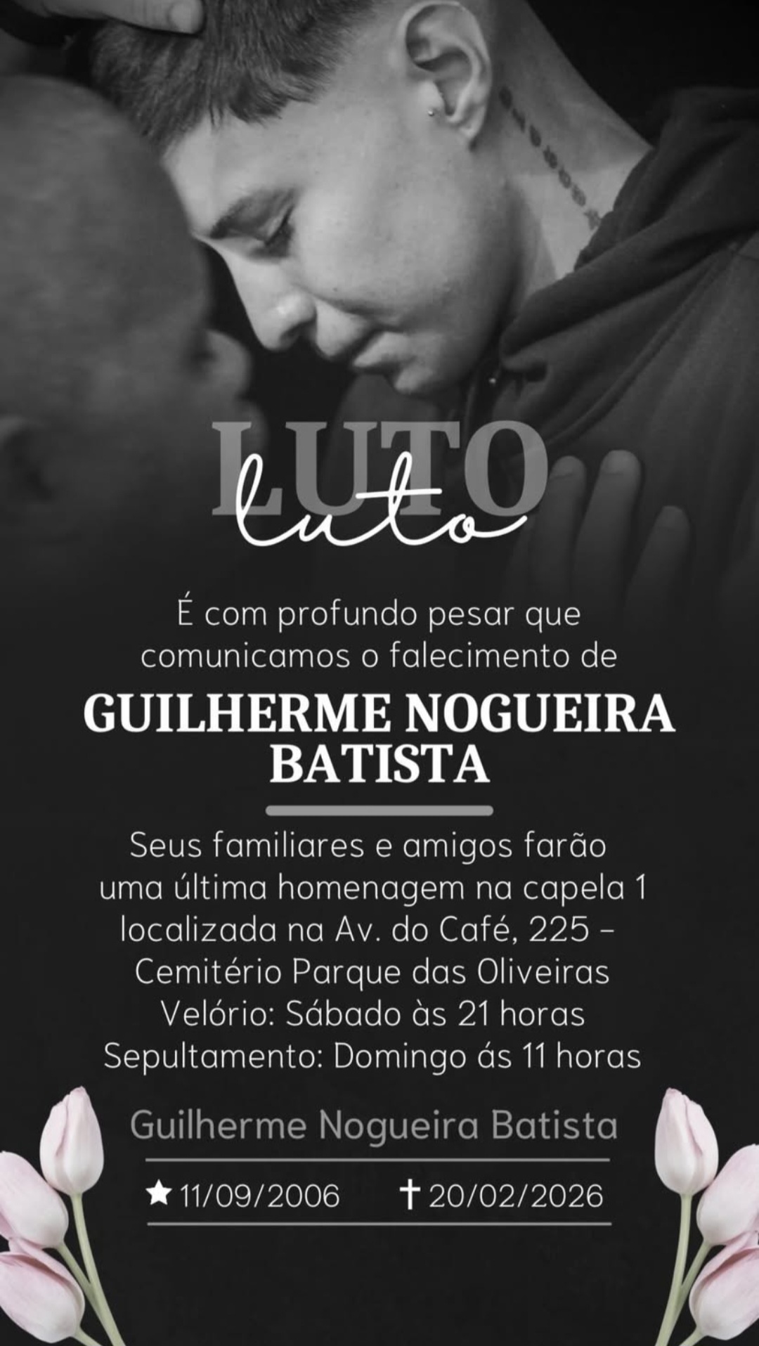 O velório de Guilherme Batista Nogueira ocorrerá a partir das 21h deste sábado (21), na Capela 1 do Cemitério Parque das Oliveiras. O sepultamento está marcado para este domingo (22), às 11h.